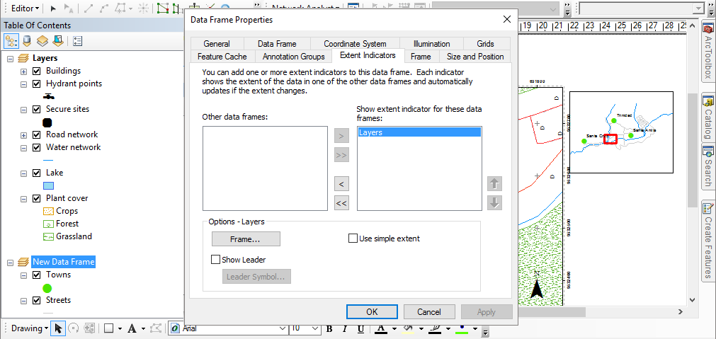 - From the Other data frames box add the Data Frame (Layers) to the Show extent indicator for these data frames box.