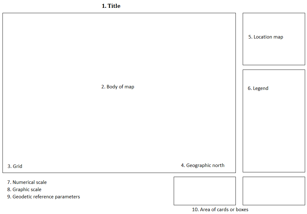 The distribution of the elements of a map is subject to the author’s requirements. The important thing is that a map can be understood by the target audience. Figure 53 suggests the layout of the map elements – although not all elements are obligatory, at least it should contain the title, grid, geographic north, scale, and legend.