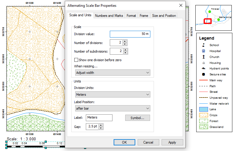 - In the Units section select meters as the division unit. In Label write: Meters.