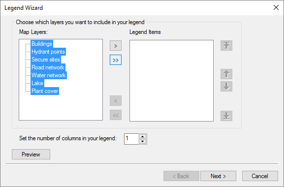 - In this window, in the Choose which layers you want to include in your legend section, from Map Layers you must pass the layers you want to show to Legend Items using the existing arrows. When there are several elements in the legend, you can choose to organize in columns in Set the number of columns in your legend.