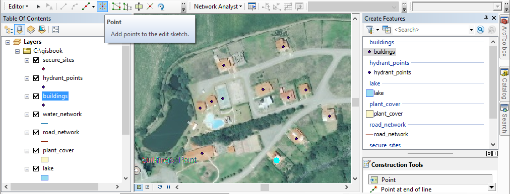 To start digitizing the points, select a point layer (e. g. buildings) in the Create Features panel. It is advisable to make sure that the Point tool is marked in Construction Tools (lower part). Then place the cursor on the center of a house and click to mark a point. The process is repeated until all the buildings are digitized (Figure 13). To make it easier to work with small objects, zoom tools are used and for large images the panning tool can be used, increasing versatility during the process. Besides using the mouse, it is possible to use the arrow keys of the keyboard, which allow greater precision in movement. It is recommended that you periodically go to the Editor > Save Edits toolbar to save your changes.