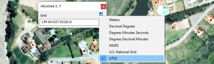 Coordinates can be entered in different formats such as meters, decimal degrees, MGRS (Military Grid Reference System), UTM, etc. To change the format, the Absolute X, Y window opens as explained above and click on a pop-up icon in the upper right corner. A list of options opens where you can select the format. The UTM format is entered as shown in Figure 15  (e. g. secure_sites: 17M 691523 9532468,17M 691684 9532576,17M 691889 9532681,17M 691437 9532615). Press the “Enter” key to enter each of the required points. Finally, you must save the edition using the Editor bar (Editor > Save Edits).
