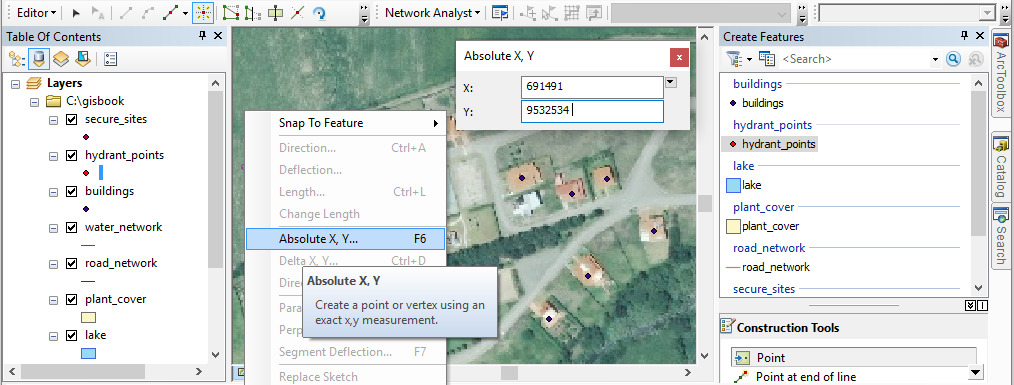 You can also create new points by entering the XY coordinates. In this case, select a point layer (e. g. hydrant_points) in the Create Features panel; do not forget to mark “Point” in Construction Tools. Then position yourself anywhere on the map, right click and select Absolute X, Y… (Figure 14). A window opens where you can enter the XY values (e. g. X = 691491; Y = 9532534 for the first point, X = 691735; Y = 9532696 for the second point). The entry is accepted by pressing the “Enter” key.