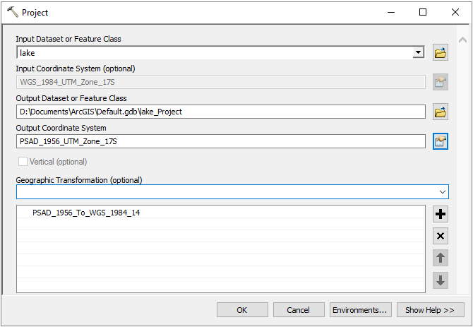Practice: A layer projected with the coordinate system “WGS 1984 UTM Zone 17S” is required to be projected with “Provisional South American Datum UTM Zone 17S”. Note that both systems have a different datum (WGS84 and PSAD56). Therefore, it is necessary to apply the corresponding transformations for each locality. The list of transformations can be found in the geographic_transformations.pdf file located in the ArcGIS “C:\Program Files\ArcGIS\Desktop10.x\Documentation ” installation folder (Figure 24).