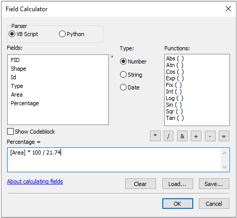 Equations can contain different mathematical operations (sum, subtraction, division and multiplication), including parentheses. Calculations can be developed using VB Script or Python. When accessing geoprocessing functions is required (including entity geometry calculation), Python is recommended. In addition, this language provides greater opportunities for scripting calculations. Further information about the field calculator can be found in “About calculating fields“, where a comprehensive list of examples is available (Figure 30).