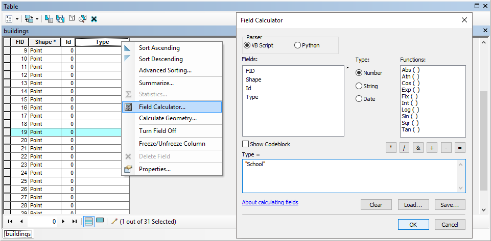 To add the same information/calculation to one or more rows, right-click on the required field (e. g. Type) and select the “Field Calculator” tool. A new dialog box opens where by default VB Script from the “Parser” section is enabled (if necessary, switch to Python). In the “Fields” section you can find all the fields of the current table, and in the “Type” section you can see the type of data (Figure 27).  To enter the information, you must type the numbers directly, enclosing the text in quotation marks (” “; for example, randomly select one or more buildings and call them “School”; you can repeat the process for “Church”, “Hospital” or “Housing”) in the window at the bottom.