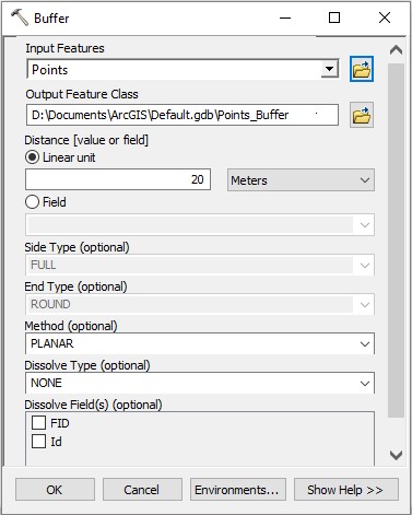• Method: Specifies the method used to create the zone of influence. The “Planar” method uses Euclidean distance (as if measured with a ruler in a projected plane), and “Geodesic” takes into account the curvature of the earth regardless of the layer coordinate system. Influence zones are not influenced by the distortion of a projected coordinate system.
