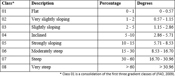 Practice: Build a slope map based on the classification proposed by FAO (2009) and group the values of the slope raster into classes (e. g. Figure 42). Table 4 presents eight classes, each of which contains the slope values in percent and decimal degrees.