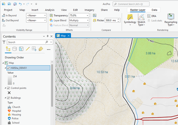 Once the hillshade layer is created (e.g., “HillSha_DEM31”), it should be moved to the top of the layer list in the “Contents” panel. With the layer selected, go to the “Raster Layer” tab in the main ribbon interface.