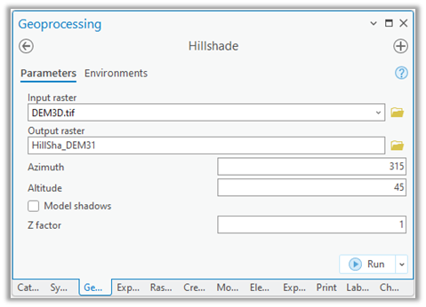 In the Hillshade tool, select “DEM3D.tif” as the input raster. This file is located in the “09_3_effect3D” folder. Then click on “Run” to generate the hillshade raster.