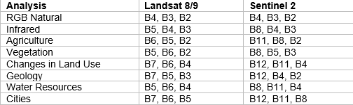 Main satellite band combinations of the Landsat 8/9 and Sentinel 2 sensors.