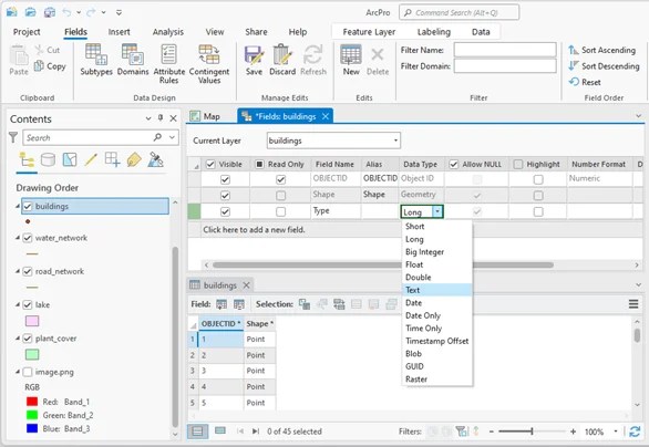 To specify the data type, the user must double-click on the corresponding cell in the “Data Type” column. Available field types include numeric values (short, long, float, or double), text, and date. The “Length” column allows setting the number of characters for text fields or the precision of numeric fields.