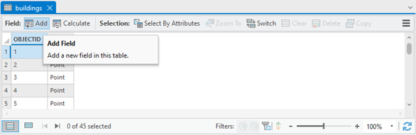 Each shapefile is linked to a table in DBF format. Additionally, the tables of a vector layer may also be stored in a Geodatabase. To access the attribute table of a vector file in ArcGIS Pro, the user must right-click on the layer (e.g., buildings) in the “Contents” panel and select the “Attribute Table” option.