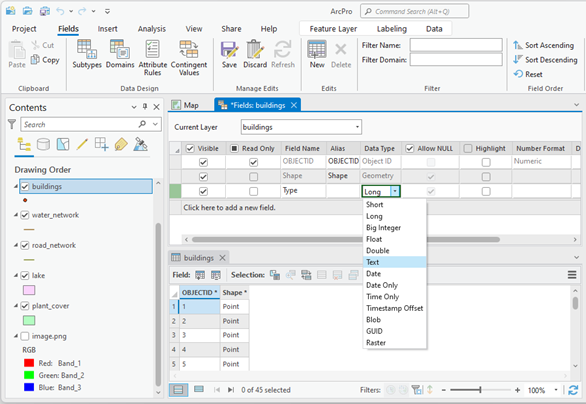 In the “Field Name” column, a name is assigned to the new field (for example, “Type”). It is essential to avoid accents, spaces, or special characters. Furthermore, the maximum length for names in shapefiles and DBF tables is ten characters.