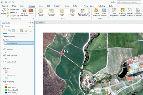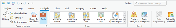 To create new vector entities such as points, lines, or polygons in ArcGIS Pro, begin by navigating to the “Analysis” tab. Within this tab, locate the “Geoprocessing” group and click on “Tools”. This opens the Geoprocessing panel, where various spatial operations can be performed.