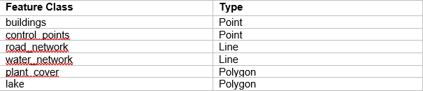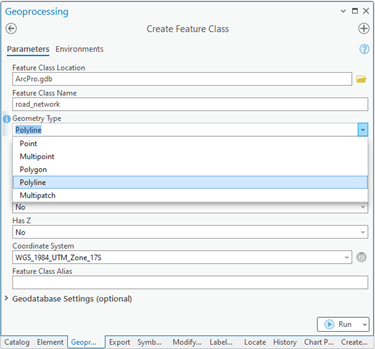 Practice: As an exercise, create vector layers of each geometry type—points, lines, and polygons—using the “Create Feature Class” tool and the “WGS 1984 UTM Zone 17S” coordinate system, as indicated in the specifications provided in Table 1.