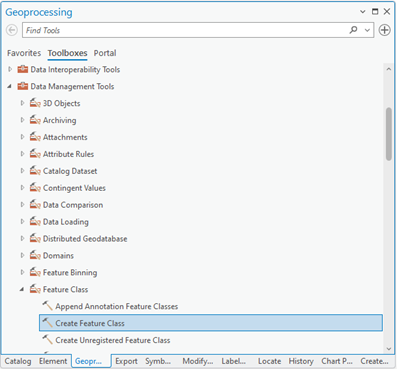 In the “Geoprocessing” panel, search for and open the “Create Feature Class” tool. This can be accessed via the following path: Geoprocessing > Toolboxes > Data Management Tools > Feature Class > Create Feature Class. The tool allows the user to define and generate new vector layers that will be used to digitize elements on a georeferenced image.