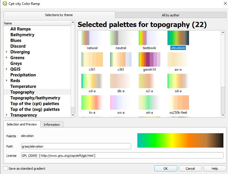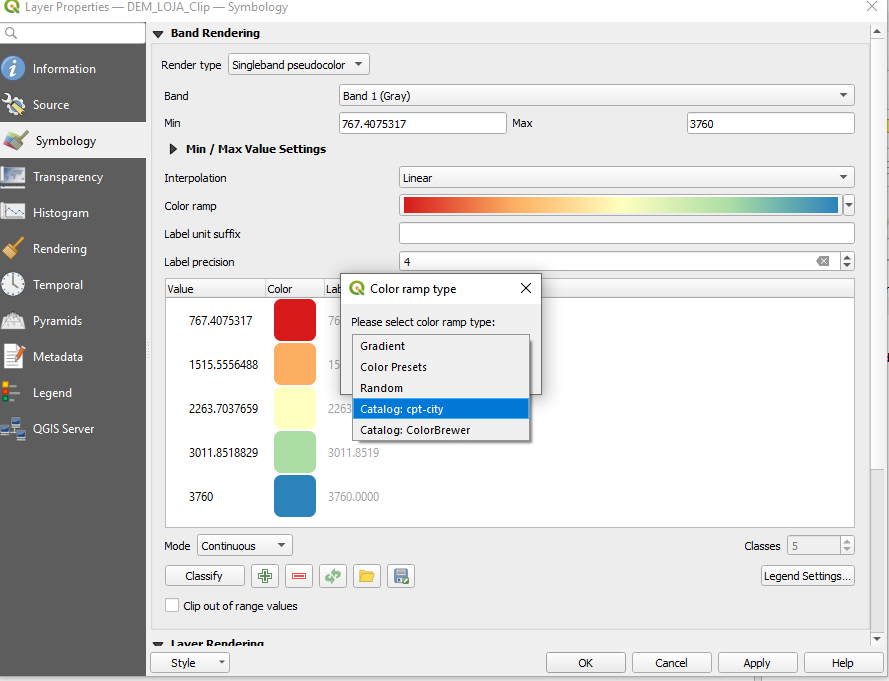 5. Finally, we will apply a “singleband pseudocolor” color ramp to the DEM, which will allow us to visualize the elevation differences across the terrain. We can also adjust the transparency of the DEM layer to enhance the visibility of the hillshade map.