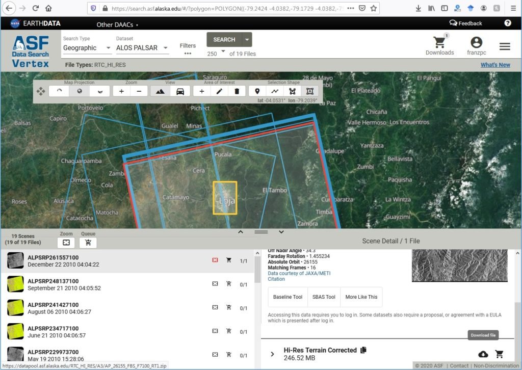 In this post we are going to see how to download a 12.5 meter resolution DEM from ALOS PALSAR, which from 2006 to 2011, PALSAR’s L-band Synthetic Aperture Radar (SAR) allowed detailed, all-weather, day and night observation and repeat-pass interferometry (more information can be found here).