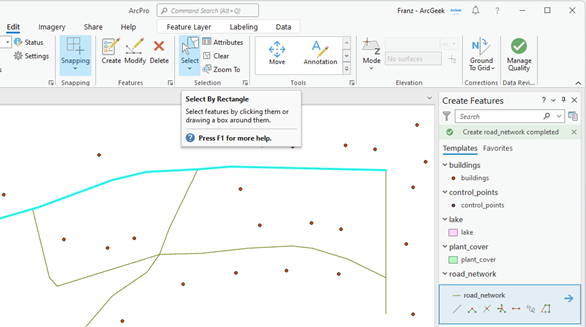 To modify a polyline, such as one in the “road_network” layer, start by selecting the layer and accessing the “Edit” tab. In the “Features” group, choose “Modify”. Within the “Modify Features” panel, under the “Tools” group, click the “Move” tool. Then select the polyline to be modified. The selected line will appear highlighted in light blue with a yellow circle indicating its active selection.