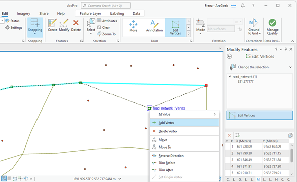 It is essential to save edits by clicking “Save” under the “Manage Edits” group. The “Edit Vertices” tool also displays the XY coordinates of each vertex, allowing for precise manipulation of the polyline geometry.