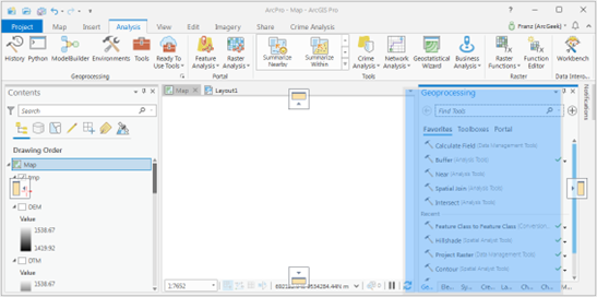 - Panels: Dockable windows that manage layers and tools. By default, the “Contents” and “Geoprocessing” panels are open.
