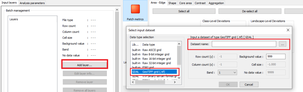 5. In the parameter analysis, we select the options: Patch metrics, Class metrics, and Landscape metrics.