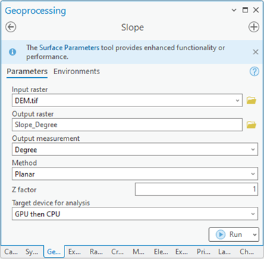 The “Slope” tool calculates the slope from the input DEM. The required parameters are: