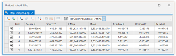 Control points table in georeferencing.