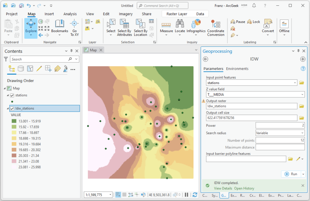That’s it! You have just interpolated point data to create a surface in ArcGIS Pro. Keep in mind, you can use other interpolation methods as well, such as “Natural Neighbour” and “Kriging”, and you can also experiment with different parameters and settings to achieve the best results for your specific dataset and project.