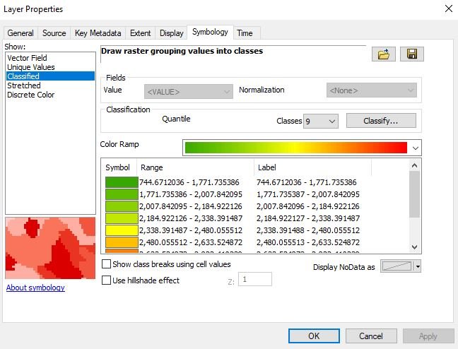1. Once the interpolation is complete, go to the layer properties and select a different color scheme. Click on the Classify button and use the Quantile method. Finally, smooth the contours.