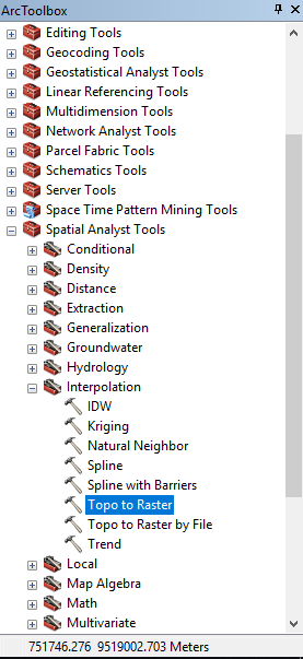 1. Open ArcGIS and go to ArcToolbox – Spatial Analyst Tools – Interpolation – Topo To Raster. Fill in the fields as follows: