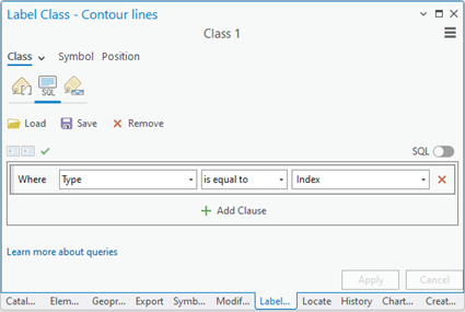To label only “Index” lines, right-click the “contour_lines” layer and choose “Labeling Properties…”. In the “Label Class” panel, go to the “Class” tab, click the SQL button, and create a new expression: set the “Type” field to “is equal to” and select “Index”. Apply the changes to display only the desired labels.