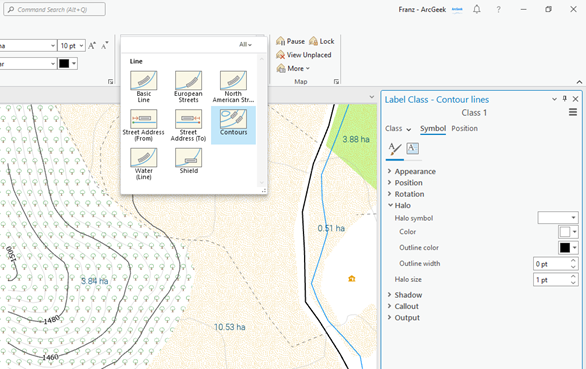 To improve label appearance, go to the “Labeling” tab, expand “Label Placement”, and choose “Contours”. Then, in “Labeling Properties…” under the “Symbol” tab, select a white “Halo” with size 1. This helps labels stand out clearly against contour lines.