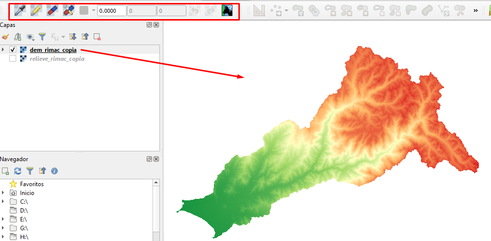 It is important to note that the modifications made will be saved, therefore, the first recommendation is to keep a copy of our original raster. Now we just need to identify the plugin in our toolbar. For this example we will use a DEM of a basin in Peru.