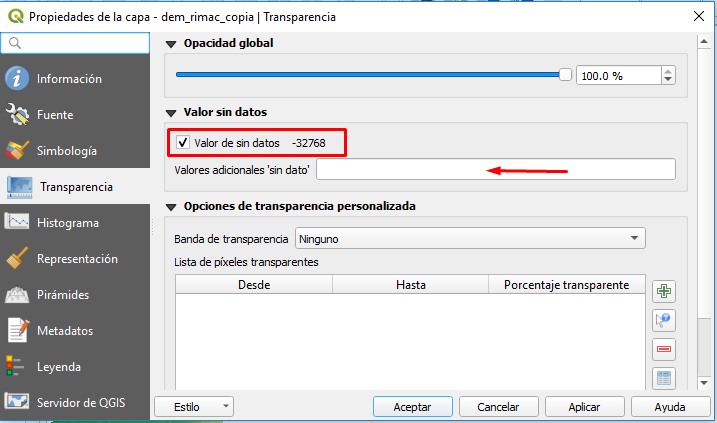 We must realize that this tool works with the properties of the layer, if we go to the “Transparency” part, we will see that it has defined a value to be assigned as “No data”, with the option to also define an additional value to be considered as “No data”.