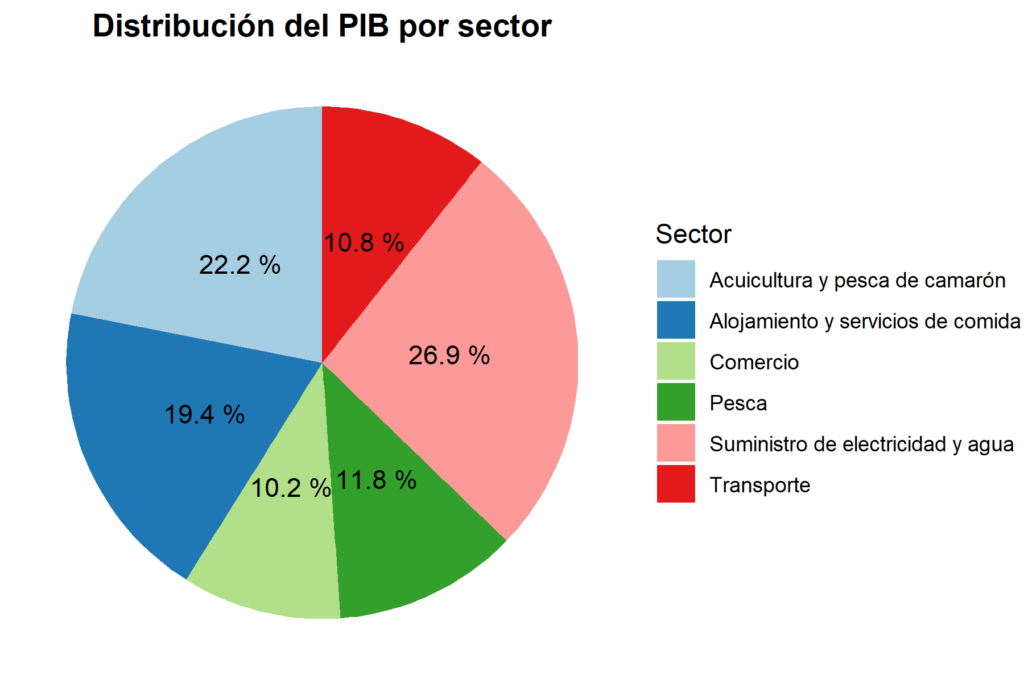 datos <- data.frame(Sector = c("Suministro de electricidad y agua", "Acuicultura y pesca de camarón", "Alojamiento y servicios de comida", "Pesca", "Transporte", "Comercio"),