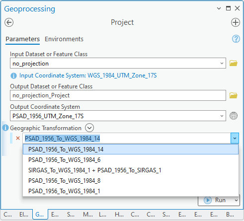 - Geographic Transformation: From the list of available transformations, select the one that matches the data’s location. For continental Ecuador, use PSAD_1956_To_WGS_1984_14. Alternatively, PSAD_1956_To_WGS_1984_6 may be used, although it may provide less accurate results.