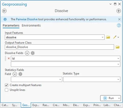 - Dissolve Fields: Select the field containing the attributes based on which the entities will be merged (e.g., the “Id” field).