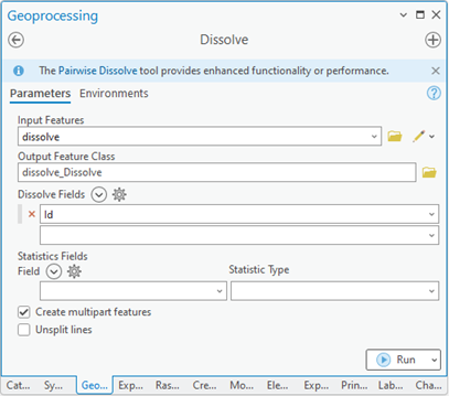 - Dissolve Fields: Select the field containing the attributes based on which the entities will be merged (e.g., the “Id” field).