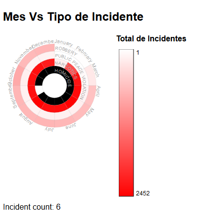 Our result shows that narcotics are the main incident recording values of up to 2,452 cases, the same is repeated with high values during all the months, in the same way, we see that it is followed in number of robberies, and finally we can see that no homicides are reported except for one occurred in the month of September.