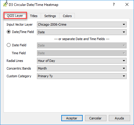 After installing the plugin, when you activate it a window will appear with a group of tabs, the first of them “QGIS layer”, the same one serves to choose the vectorial layer that will be used to generate the graph of the heat map (Chicago-2006-crime).