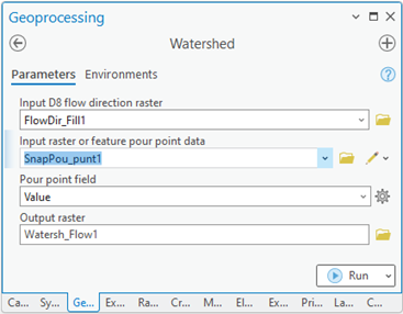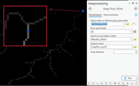 To assign the discharge point of the watershed, the “Snap Pour Point” tool is used. A manually digitized point is required and must be placed directly over the outlet.