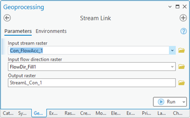 The “Stream Link” tool connects the segments of the drainage network to form continuous flow paths. It requires the conditional raster and the flow direction raster as inputs.