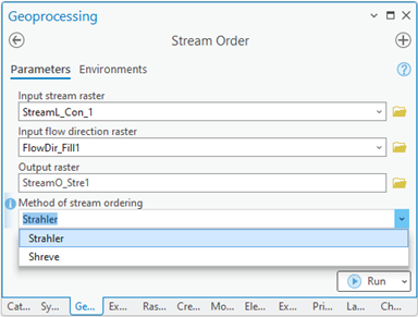 Required inputs are the stream order raster and the flow direction raster.