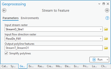 Geoprocessing > Toolboxes > Spatial Analyst Tools > Hydrology > Stream to Feature