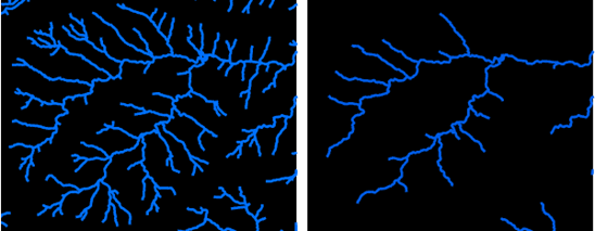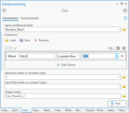 With the flow accumulation raster ready, a drainage network can be created using the “Con” tool. This tool classifies cells with accumulation values above a user-defined threshold, producing a binary raster representing the network.