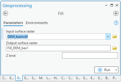The first step involves using the “Fill” tool to correct imperfections or empty cells in the DEM. This step is important because depressions in the terrain can obstruct water flow paths. The “Fill” tool processes the DEM by eliminating pits and ensuring a continuous surface for flow analysis.