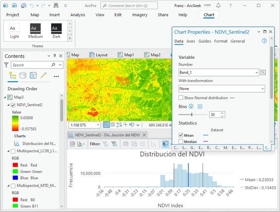 To create a histogram, the user can right-click on the raster layer, for example, the “NDVI_Sentinel2” raster that was previously generated. By selecting “Create Chart” followed by “Histogram,” the graph will illustrate the distribution of NDVI values across the raster.